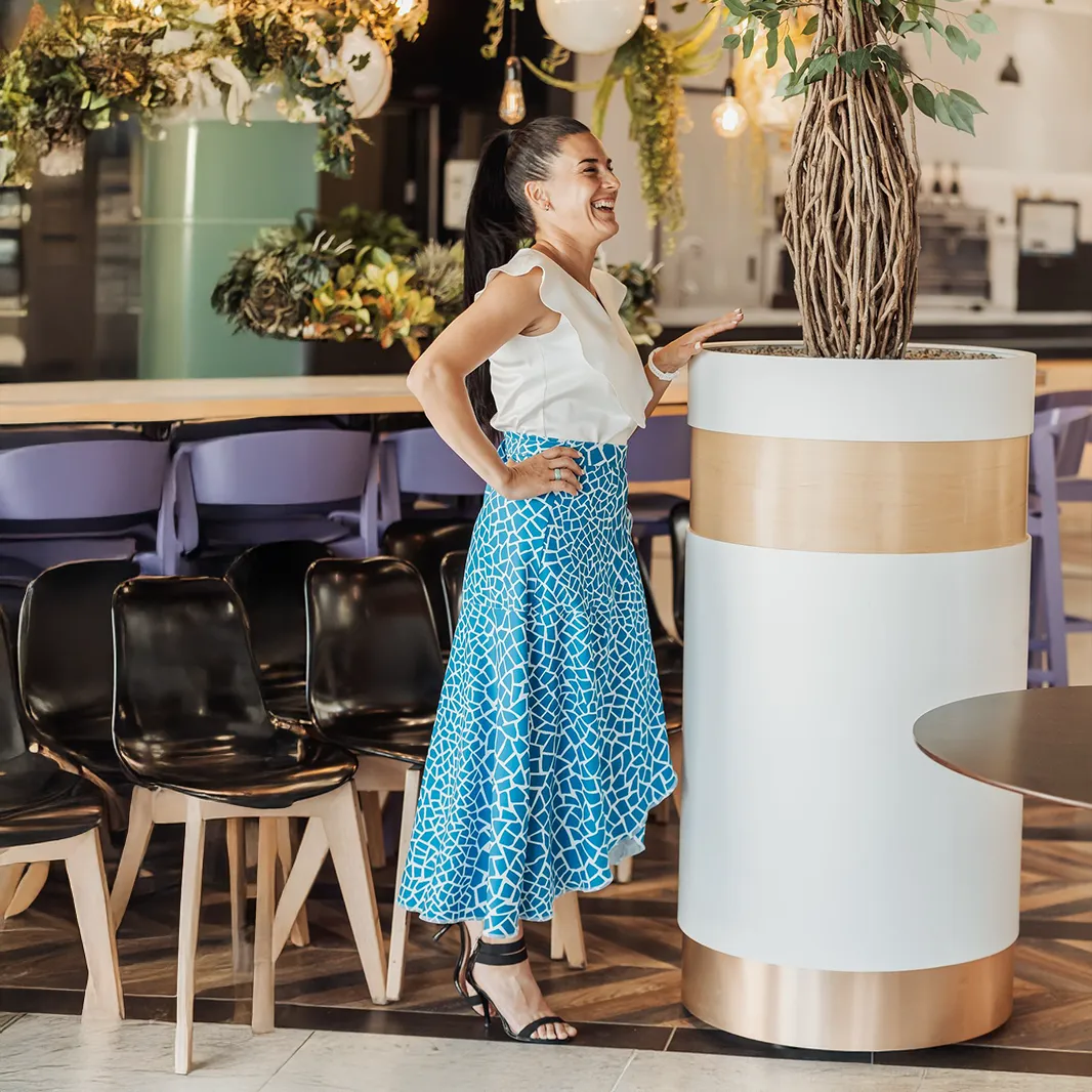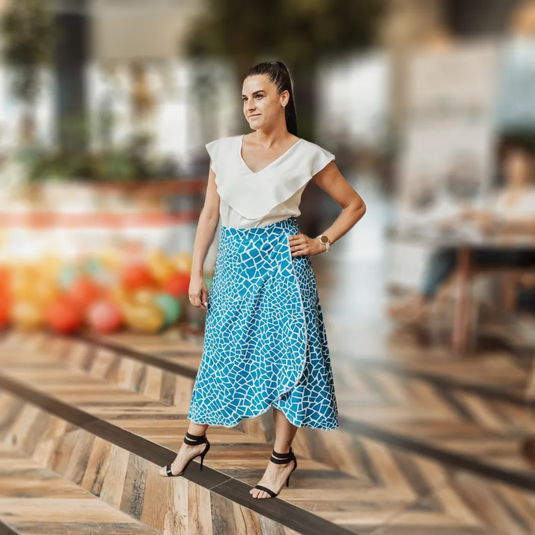 Lejeritate eterică și linie feminină. Fusta pe fond albastru-alb, cu imprimeu alb, are ca element distinctiv răsucirea din zona taliei, care subliniază subtil talia, în timp ce căderea ei diafană oferă mișcare elegantă la fiecare pas. Alegerea ideală pentru evenimente de vară, plimbări pe litoral sau cine de seară, când confortul se întâlnește cu rafinamentul.