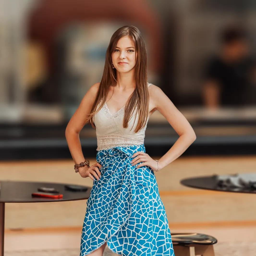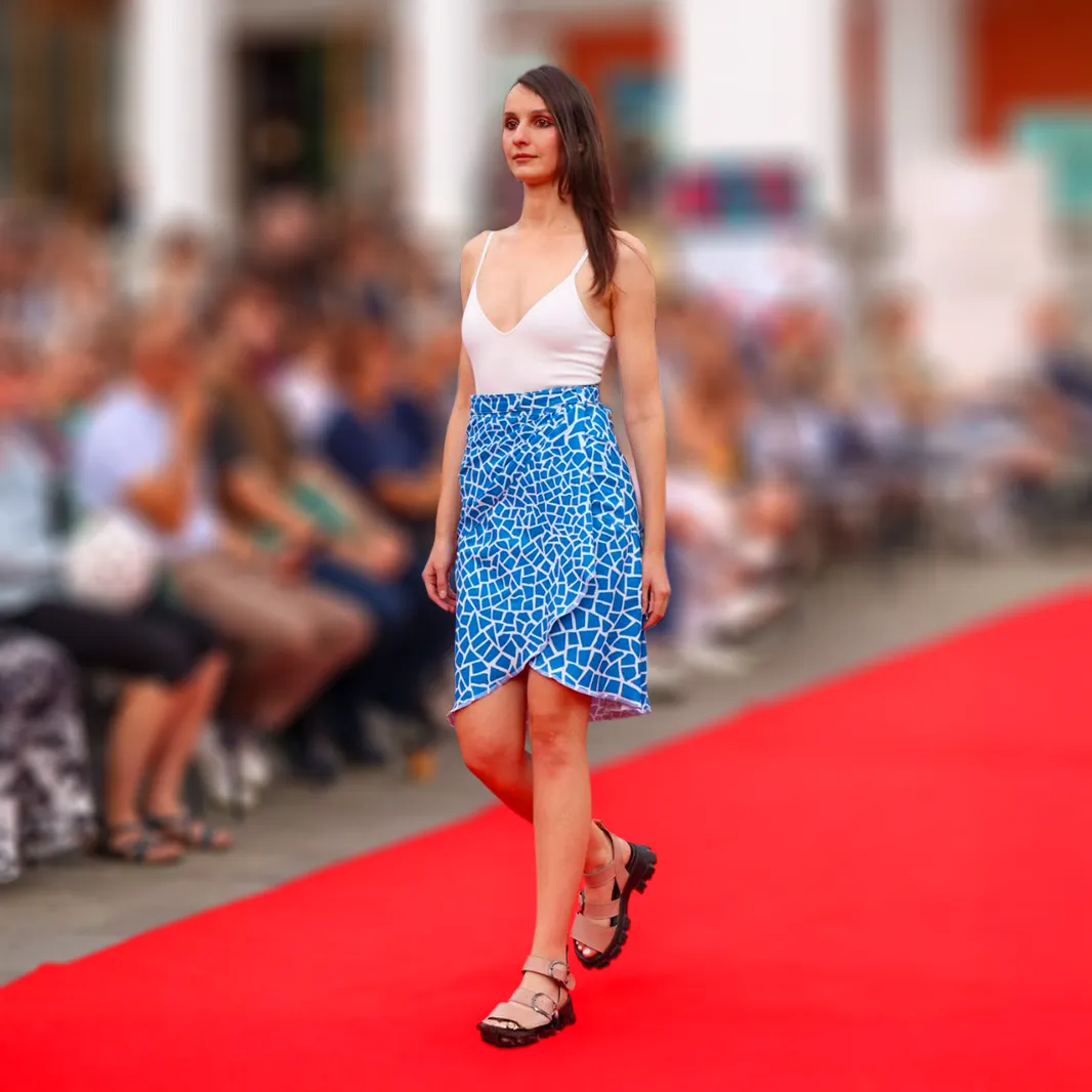 Proaspătă, jucăușă și feminină. Imprimeul alb pe fond albastru-alb evocă o atmosferă mediteraneană plină de prospețime, iar răsucirea de la talie conturează delicat silueta. Perfectă pentru activități de zi, plimbări lejere prin oraș sau o întâlnire elegantă la cafenea.